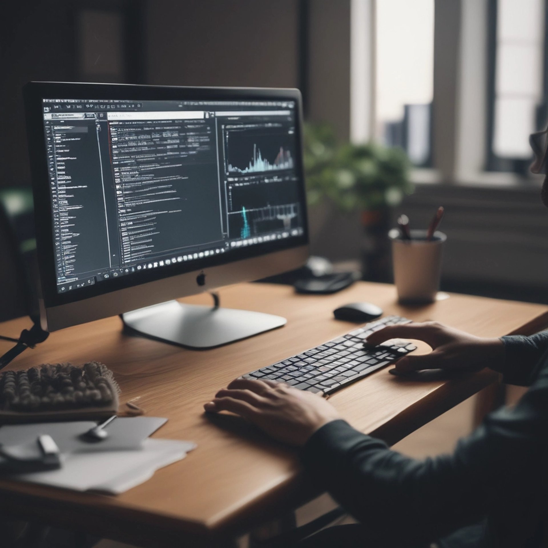 Close-up of hands typing on a keyboard with website wireframes on the screen.